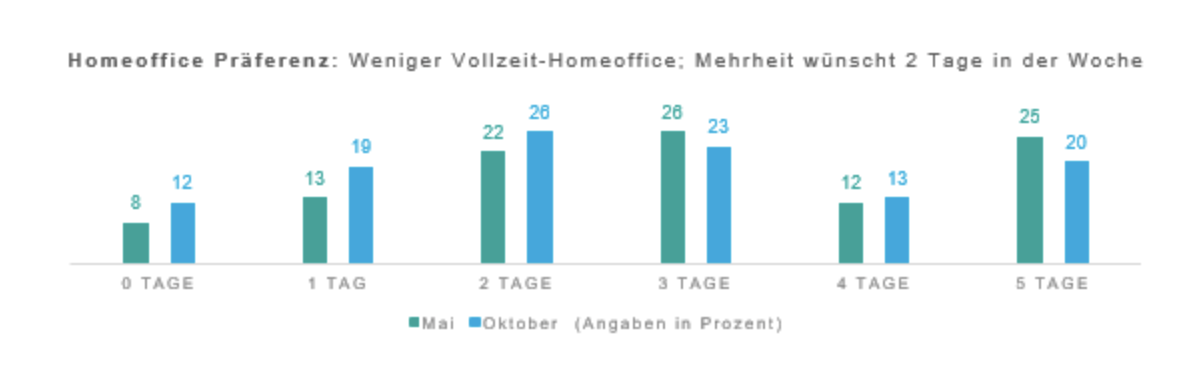 Allerdings sehen wir in den Daten interessanterweise über die Zeit einen Rückgang der zeitlichen Präferenzen für das Arbeiten im Homeoffice (siehe Abbildung 1). Während zu dem Befragungszeitpunkt im Mai 2020, direkt nach dem ersten Lockdown, die höchste Zustimmung bei der persönlichen Präferenz noch bei drei Tagen Homeoffice pro Woche war, ist diese im Oktober 2020 auf zwei Tage zurück gegangen. Auch wollen deutlich weniger Befragte (-5 Prozent) komplett im Homeoffice arbeiten. Diese Daten machen deutlich, dass viele Arbeitnehmende sich eine hybride Form des Arbeitens mit einer Kombination von Präsenzarbeit und mobilen Arbeiten wünschen. In anderen Fragen der Studie sehen wir, dass die Studienteilnehmenden sowohl die Vorzüge der Präsenzarbeit für den sozialen Austausch und das kreative Zusammenarbeiten mit Kollegen und Kolleginnen schätzen, als auch die Vorteile des mobilen Arbeitens, wie mehr Ruhe und fokussiertes Arbeiten sowie den Wegfall des Pendelweges wahrnehmen.