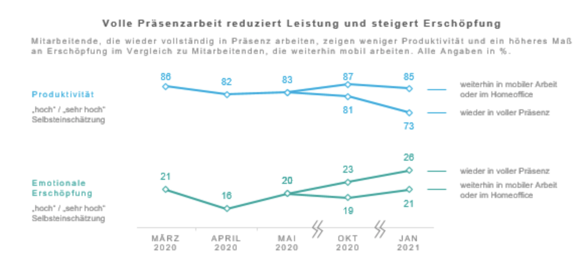 Diese Zahlen zeigen eindrücklich, dass durch eine Rückkehr zur Präsenzarbeit, die Gefahr besteht, dass die Leistungsfähigkeit einzelner Mitarbeiter und der ganzen Organisation leidet, und auch Stress und Belastung gesteigert werden.