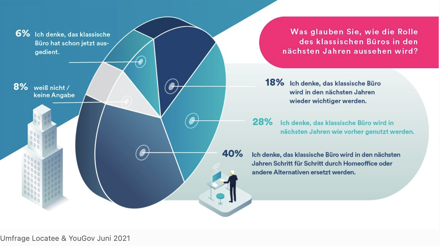 Der Wegfall des Pendelns wurde laut Statista Global Consumer Survey von vielen Menschen als großer Zugewinn von Lebensqualität erlebt. Büros werden darum künftig vermehrt nach ihrer Lage und Erreichbarkeit bewertet. In Zukunft wird es gemäß einer Studie vom Verband Deutsches Reisemanagement zudem weniger Geschäftsreisen als früher geben und gleichzeitig mehr Online-Meetings, die im Büro ungestört möglich sein müssen.